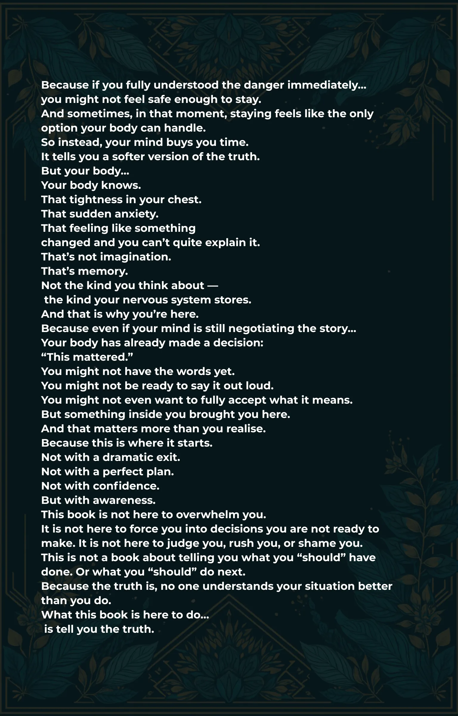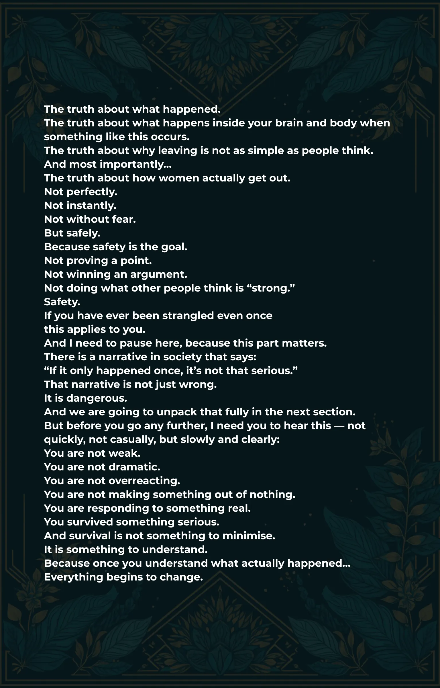 Inside, you will understand what is happening in your body and mind, why it feels so hard to leave, and what steps actually make it safer. You will learn how to regulate your nervous system so you can think clearly, how to break the silence without putting yourself at risk, and how to start creating a safe exit without chaos or panic.